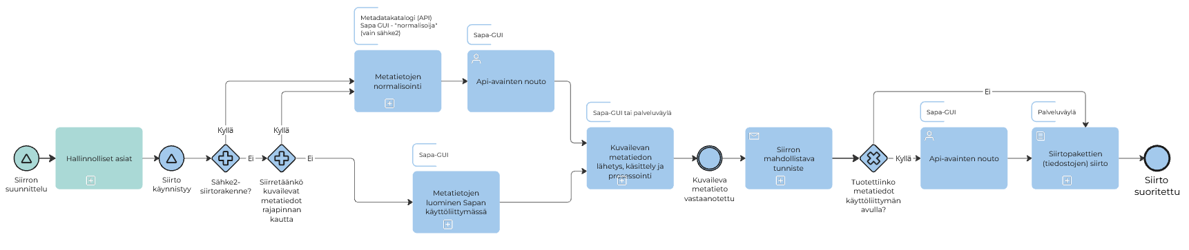 Kuten yllä olevasta kuvasta voidaan havainnoida, on kontekstimetatietojen siirto rajapinnan avulla pakollista vain silloin, kun siirrettävä siirtopaketti on Sähke2 -siirtorakenteessa. Tämä johtuu siitä, että Sähke2 -siirtorakenne sisältää sekä kontekstimetatiedot että itse tiedostot. Muissa siirtorakenteissa siirto voidaan vaiheistaa siten, että ensin tuotetaan kuvailevat kontekstimetatiedot joko rajapinnan avulla (metatiedot tulee olla normalisoitu metadatakatalogin avulla) tai Sapan siirtokäyttöliittymän avulla osoitteissa https://ka-sapa.arkisto.fi tai https://sapa.arkisto.fi (Valtionhallinto).
